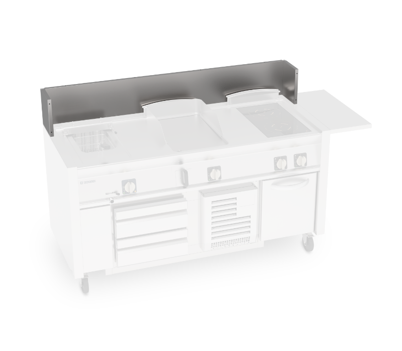 Lo splashback standard, alto 25 cm, è fornito di serie per garantire protezione e igiene durante il lavoro. Su richiesta, può essere realizzato in versione ribassata (17 cm) e personalizzato esteticamente con il logo del cliente, applicabile sia sul fronte che sul retro.