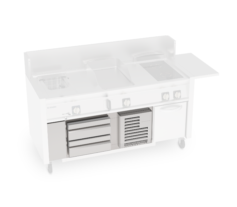 Su richiesta, è possibile integrare una base refrigerata, disponibile esclusivamente per il modello da 160 cm, per avere ingredienti sempre a portata di mano e ottimizzare i flussi di lavoro.