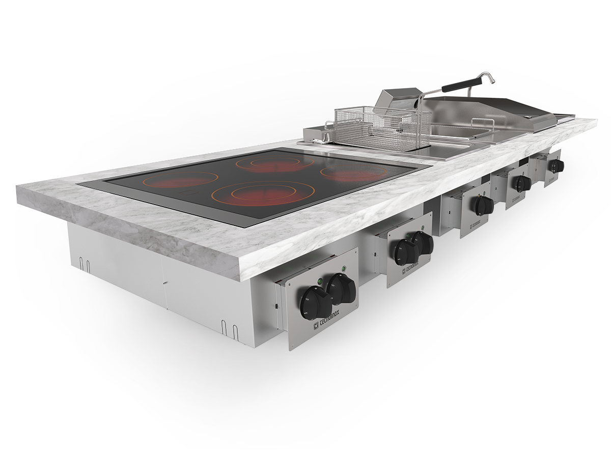 Flessibilità, semplicità ed economicità sono le parole d’ordine delle attrezzature Drop-in che permettono di realizzare una cucina modulare davvero su misura. I moduli possono infatti essere inseriti sopra il piano o a filo, mentre i comandi possono essere sistemati su un frontalino oppure sul piano a lato della macchina.