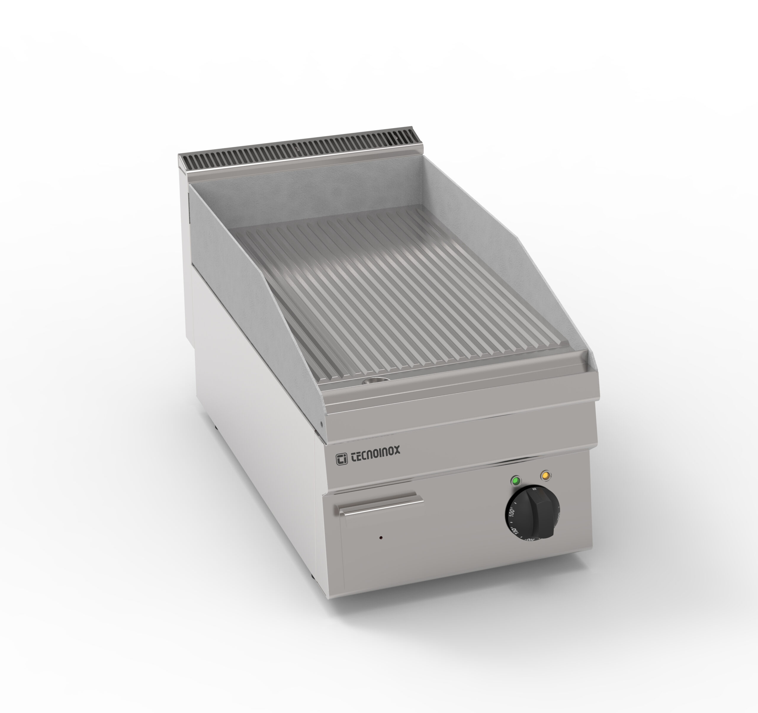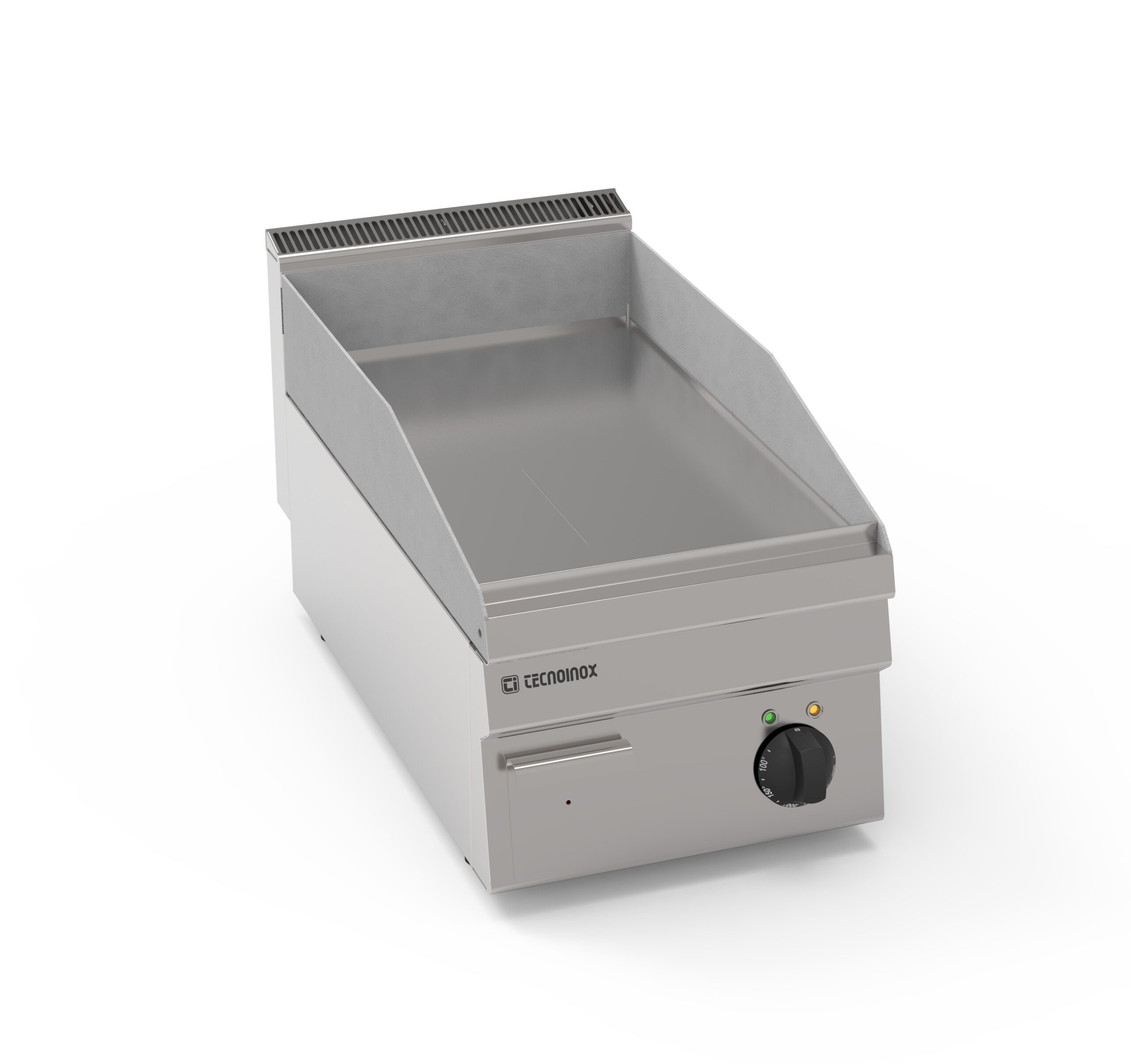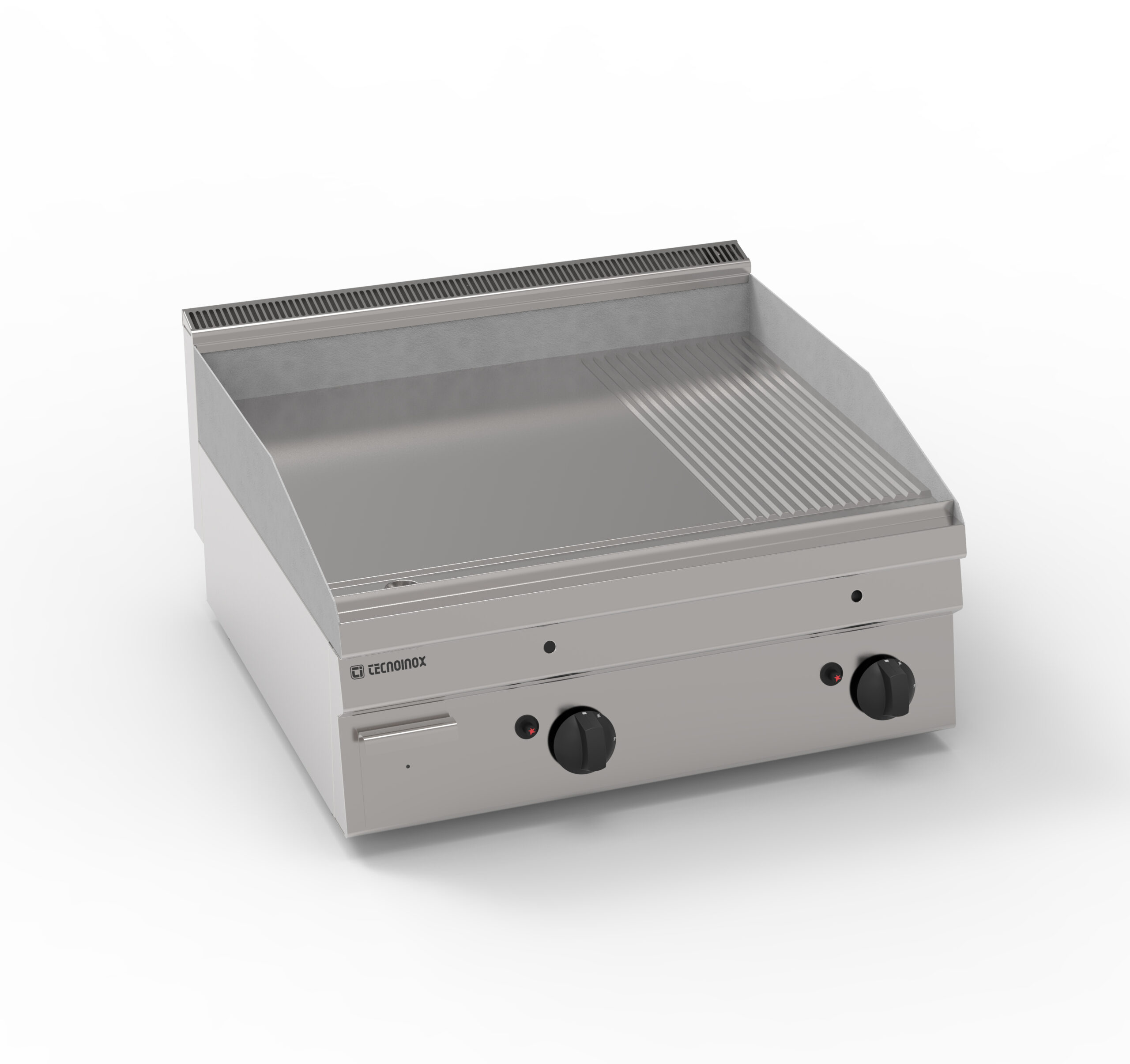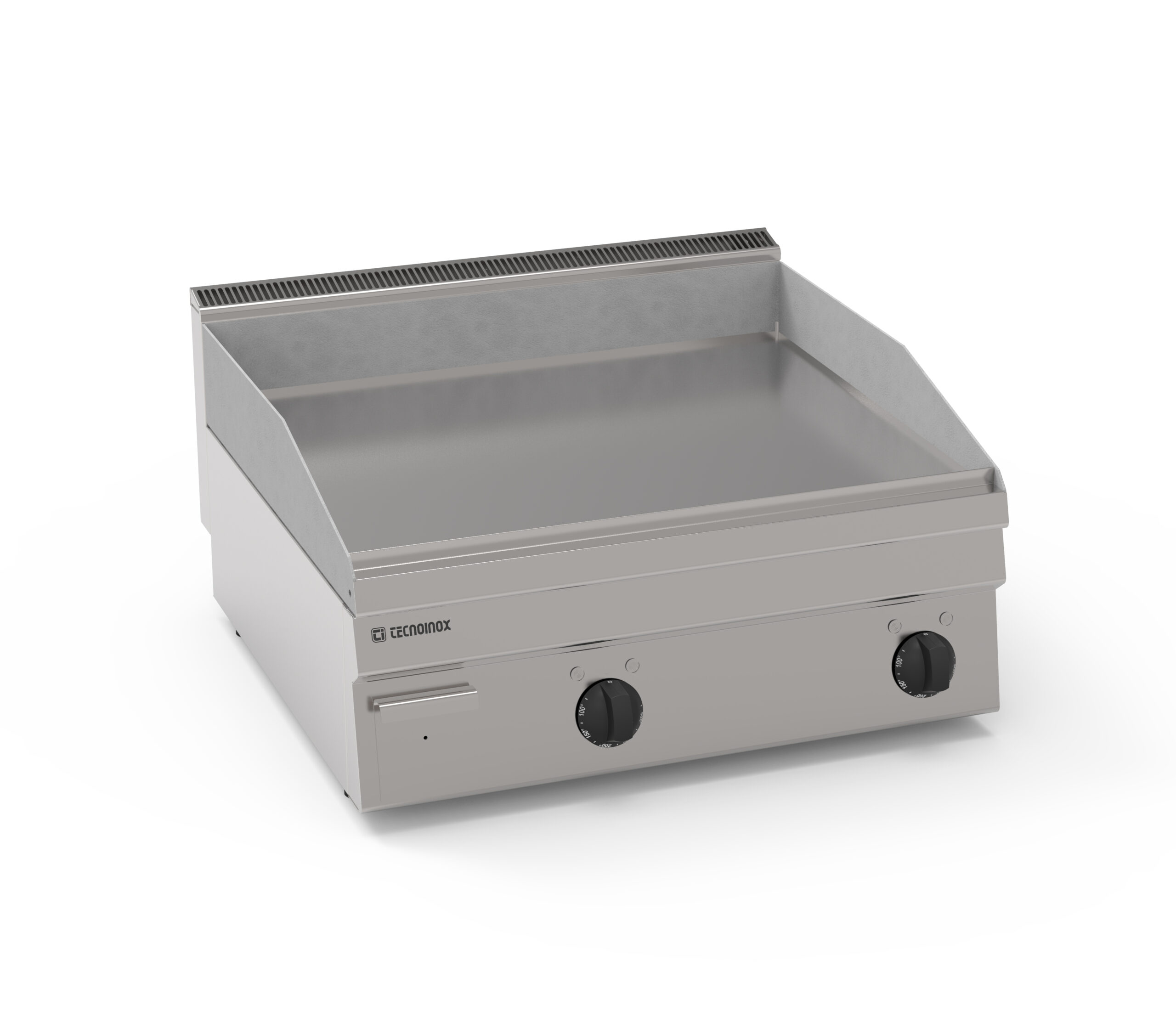 I Fry-Top Tecnoinox in versione top, ideali per la cottura alla piastra, possono essere a gas o elettrici e possono essere dotati di diverse piastre: in acciaio liscio, in acciaio rigato, in acciaio rigato ⅓ anche nelle versioni cromato o cromato spazzolato con valvola termostatica per il rilevamento della temperatura e il blocco di sicurezza.