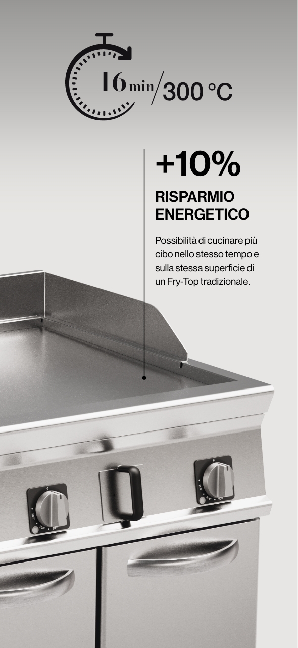 La piastra raggiunge la temperatura operativa in tempi brevissimi, consentendo di migliorare l’efficienza in ogni servizio.